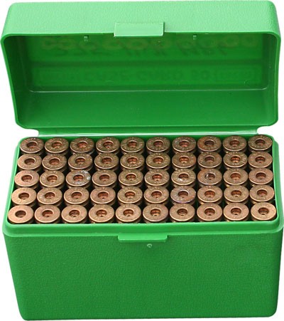 The original ammo box, this series of 50 round cases set the standard for all other MTM cases sold today. The first choice for rifle enthusiasts througout the world, many tell us they believe we have the finest ammo and accessory boxes in the business. Features: * a scuff resistant textured surface * living-hinge with our one million open-close cycle/10 year guarantee * Snap-Lok latch * Indestructability * A load label Fits: 224 Clark, 240 Wby. Mag., 257 Roberts, 270 Win., 25-06 / 280 Rem., 30 Gibbs, 30-06 Spr., 318 Westley Richards, 338-06 A-Square, 35 Whelen, 375 Rimless 2 1/4?, 6.5 Carcano, 6.5x257 Roberts, 6.5-06 A-Square, 6.5x54mm Mann-Schone, 6.5x 55 Swedish, 7x 64 Brenneke, 7x72 Rimmed, 7x57 / 9.3x57mm MAUSER, 8x57J, 7.7 Jap, 7.7x58 Jap., 8mm-06, 9.3x74. 410 Shotshells Max. OAL= 3.57 "